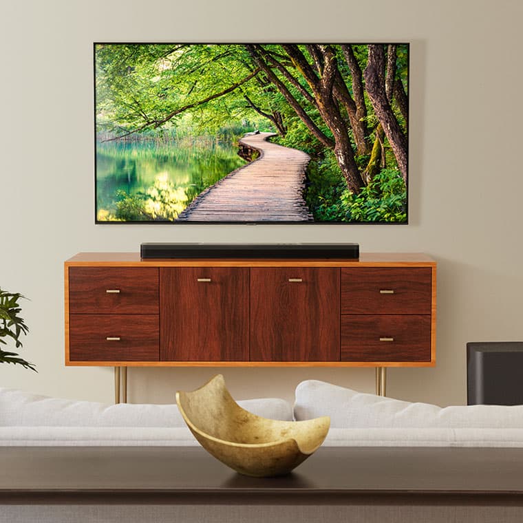 Keep in mind that if you keep the wireless speakers attached to the main segment of the sound bar for charging, it is wider than a 55” TV and may hang off your TV stand. I ran into that exact problem myself initially.