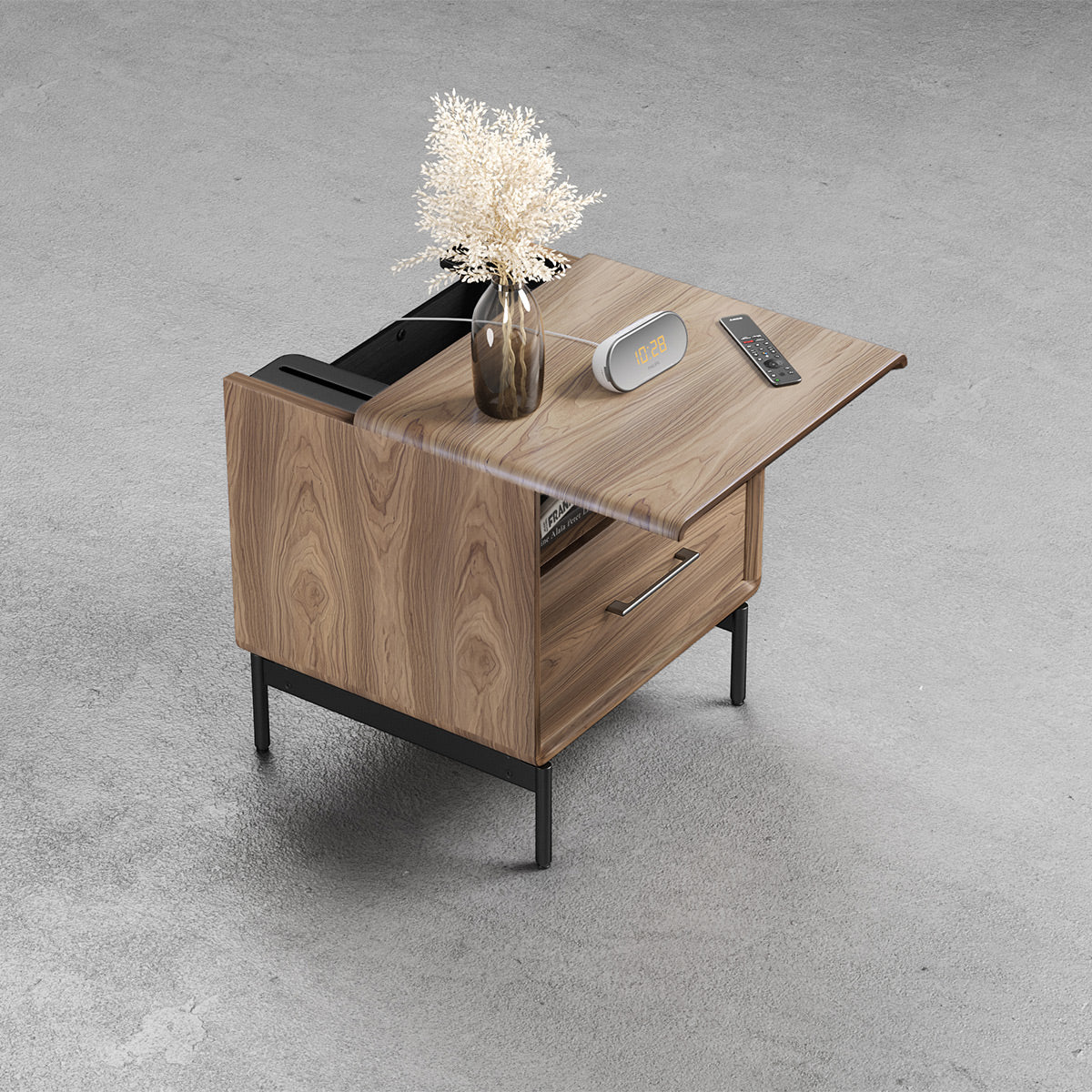 LINQ nightstands feature a unique sliding top, which provides easy access to the power supply in the back and extends the top surface forward, keeping things within easy reach when lying in bed.