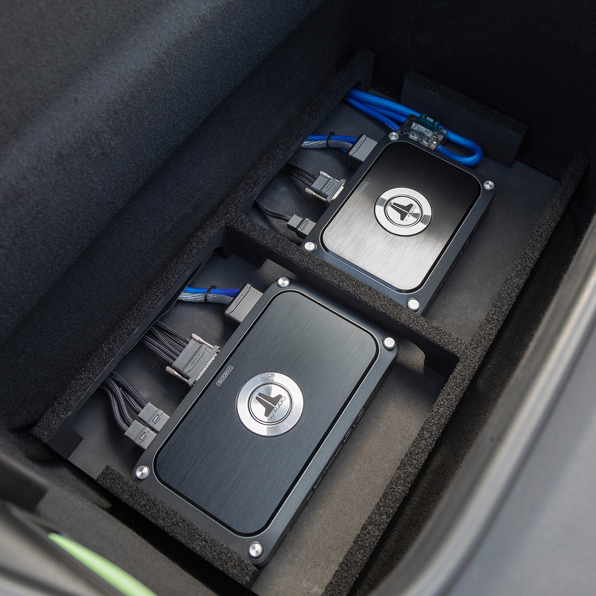 One of the biggest challenges we faced was to ensure that the aesthetics of the vehicle weren’t compromised during the course of the design and installation of the system. For example, we built a simple amp rack in the frunk which included a false floor to cover and protect the two JL Audio amplifiers (one for the speakers, and one for the sub). This not only hid the amplifiers from view but also allowed our client to continue to use the frunk if he had to.