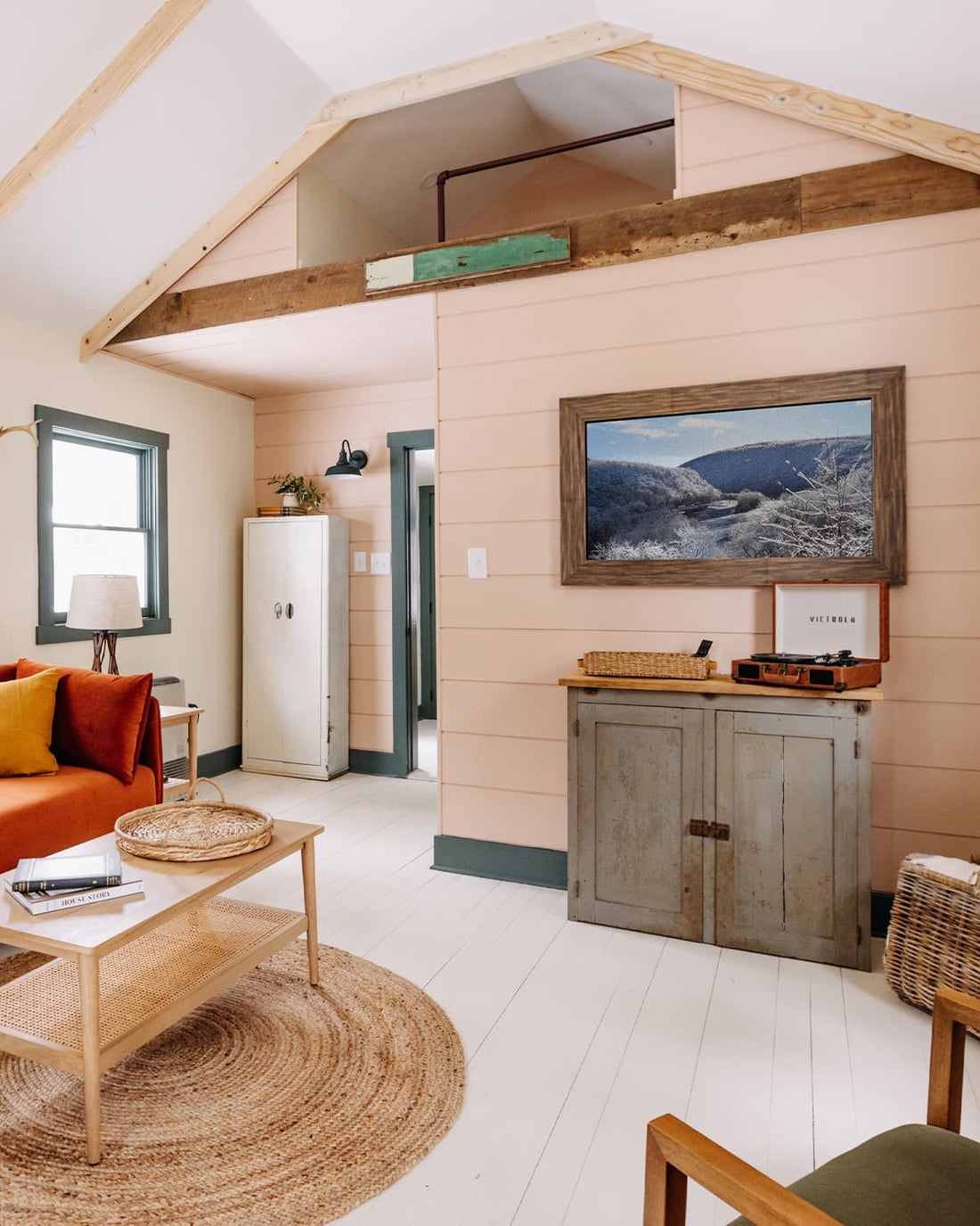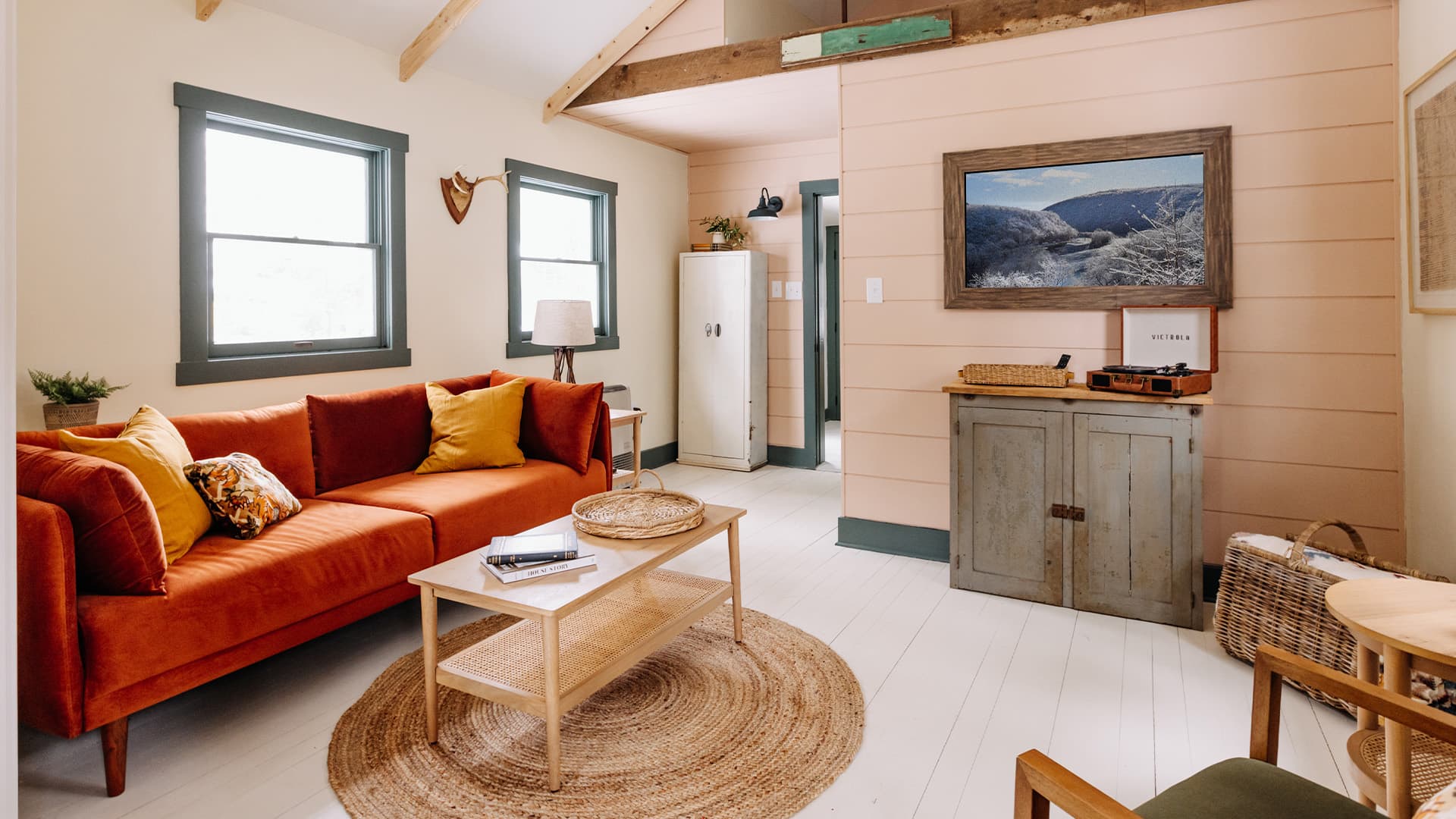 We installed Samsung Frame Smart TVs throughout, which are made to look unmistakable to artwork on the wall and allow for easy access to streaming services via WiFi in this case (or a hardwired connection). Deco TV Frames, a genius solution for customizing Samsung Frame TVs, were selected for each TV in vintage materials like distressed woods and antiqued golds to further "camouflage" the TVs into the rustic cabin decor. Colorful retro-inspired Victrola turntables and vintage-inspired typewriters (sorry, now sold out) were placed in each cabin alongside a handpicked selection of classic used records found at local record stores.