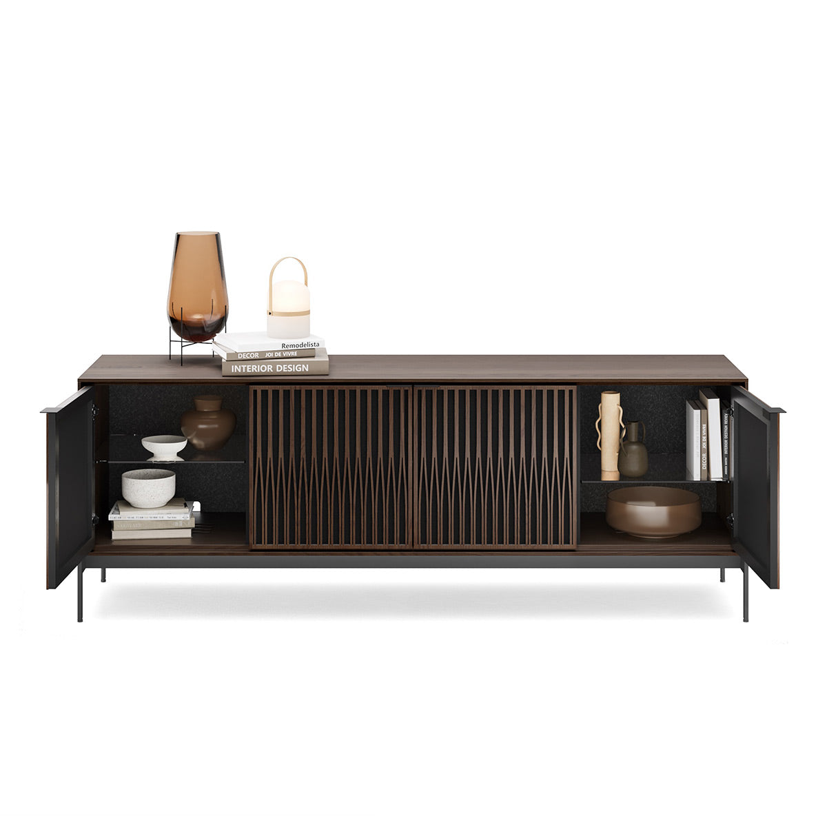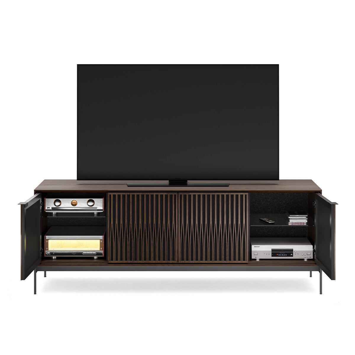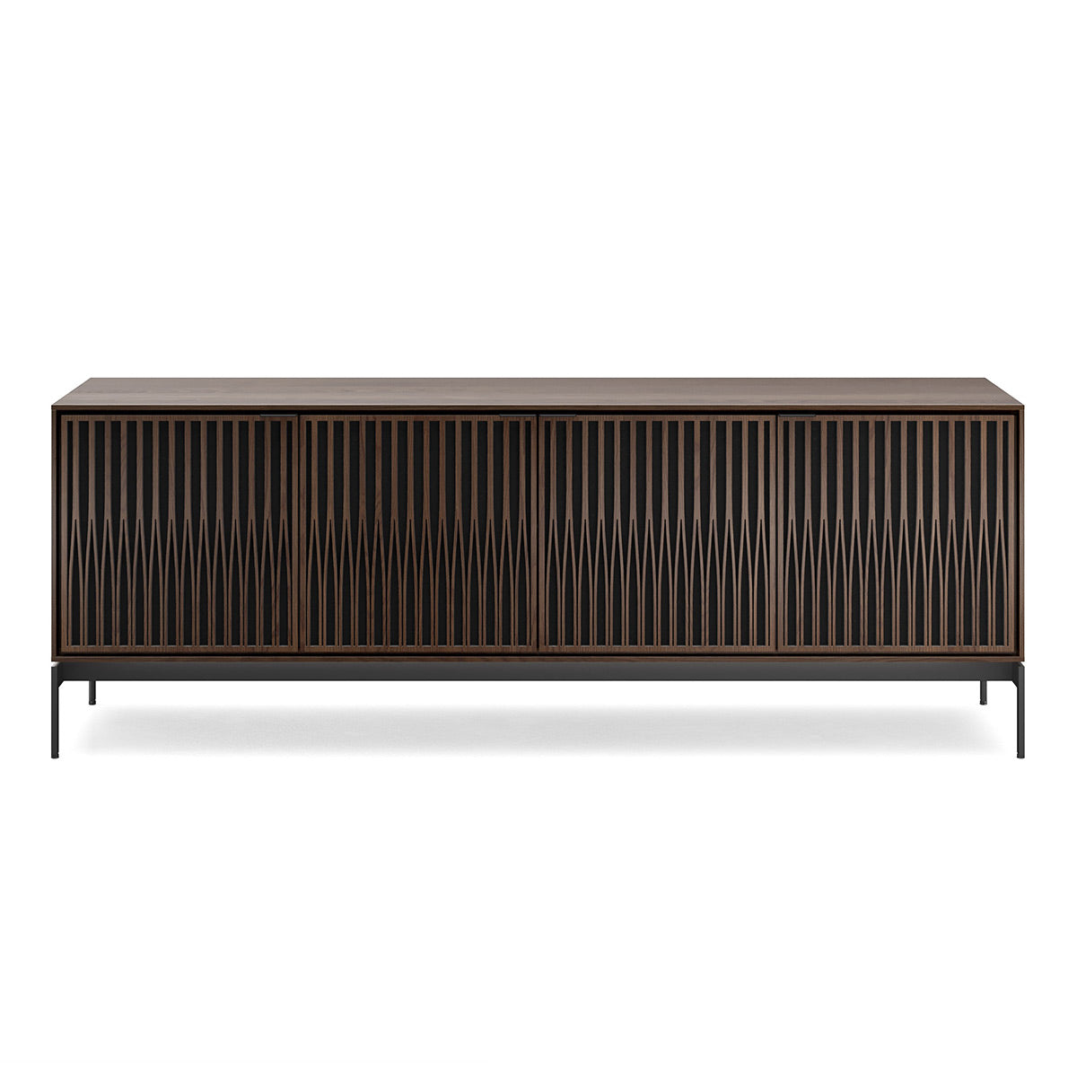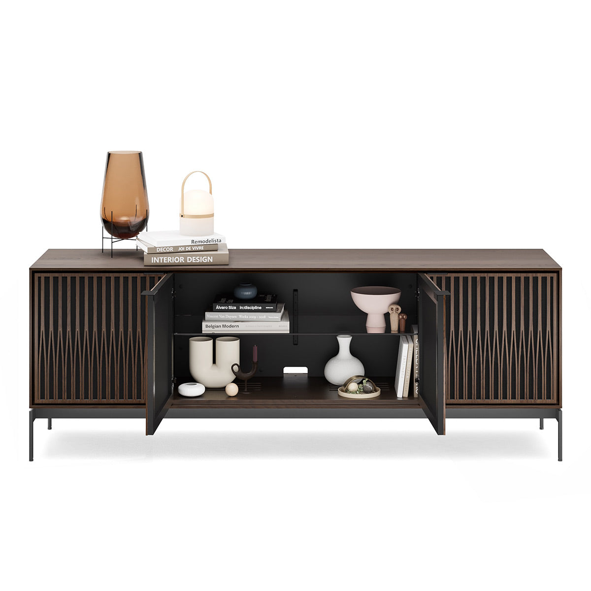 Precisely crafted doors with perforated metal backing offer ventilation and IR-remote compatibility, keeping your media components accessible and ventilated with sleek, understated elegance. Inside the doors, a black fabric lining adds a refined touch, while fully adjustable soft-close hinges ensure they stay silently in perfect alignment.