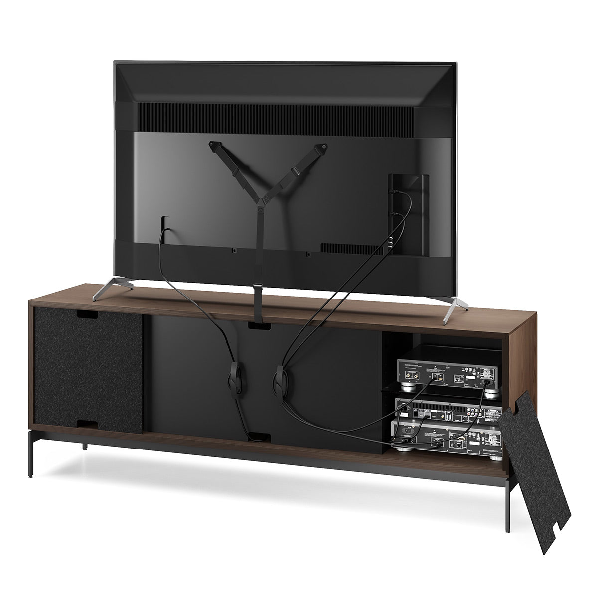 Removable felt panels dampen sound, prevent rattling, and provide easy access for quick component swaps.  Wire management channels and wraps keep cables neat and tangle-free.  The included TV safety strap secures a television, helping prevent accidental falls.