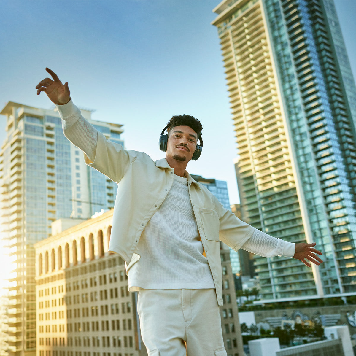 You decide how much of the outside world you let in. These over-ear headphones come equipped with Quiet and Aware Modes that let you toggle between full noise cancelling or full awareness of your surroundings. Or better yet, create your own custom mode and have the power to adjust the noise cancellation as you see fit, add Wind Block to tune out breezy environments, and revisit the custom setting at any time.