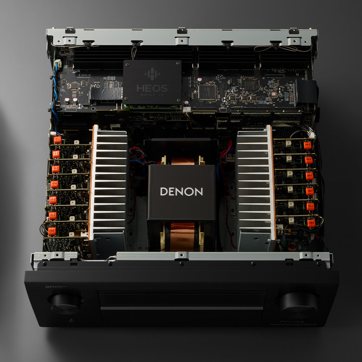 The AVR-A10H’s 13-channel monolithic amplifier delivers 150 watts per channel. As is typcial in high-end amplifier designs, each channel is built on its own PCB to minimize crosstalk and distortion.