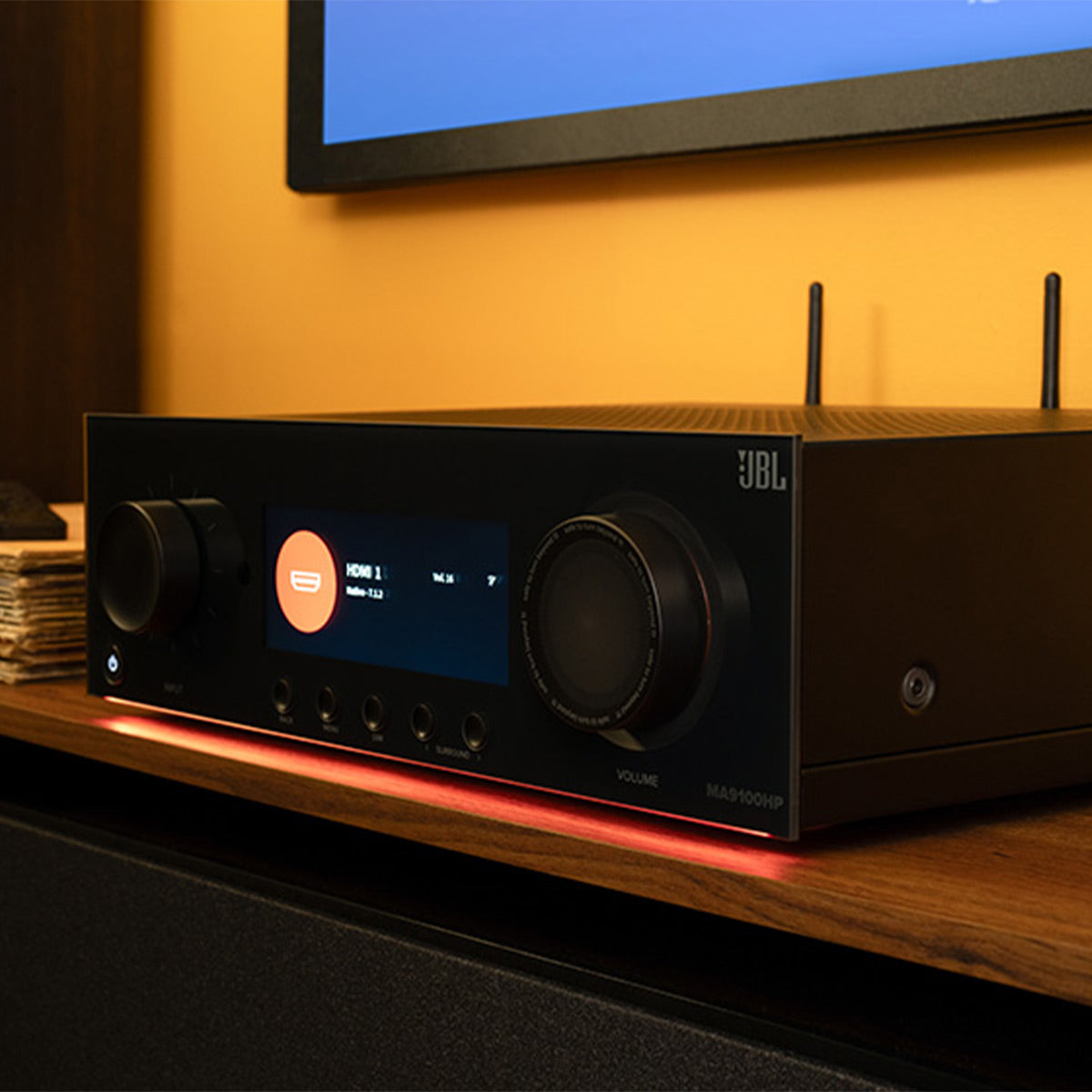 The JBL MA9100HP is a high-performance AV Receiver that delivers stunning realism with the latest 8K HDMI specifications and native 9-channel decoding of immersive audio from Dolby Atmos and DTS:X for the ultimate home cinema experience.