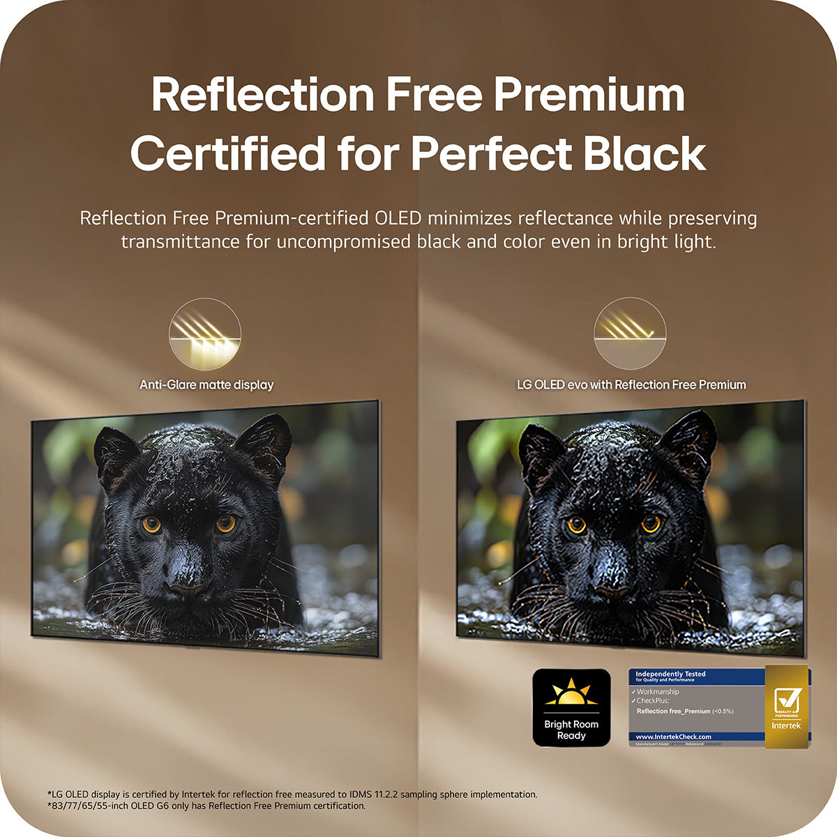 LG OLED TVs with Reflection Free Premium technology minimizes screen reflections so you can enjoy a clear, immersive picture—even in bright rooms. By reducing glare from windows and lights, the screen maintains Perfect Black and Perfect Color*, plus sharp details, letting you stay focused on what’s on screen—not what’s around it. Reflection Free Certified that goes beyond Anti-Glare.