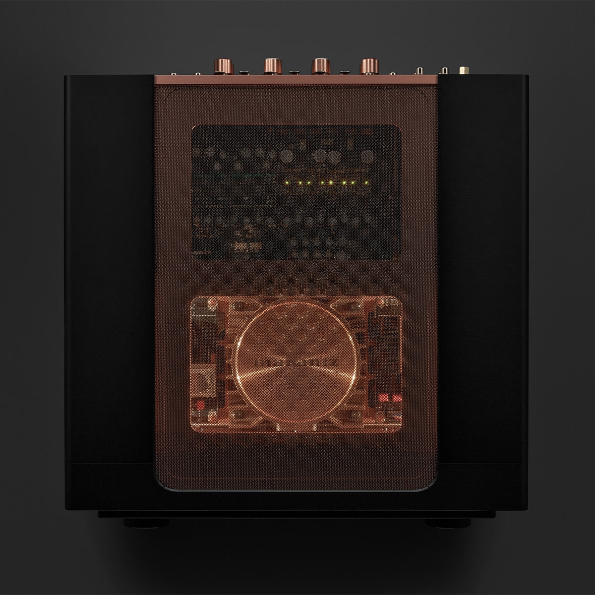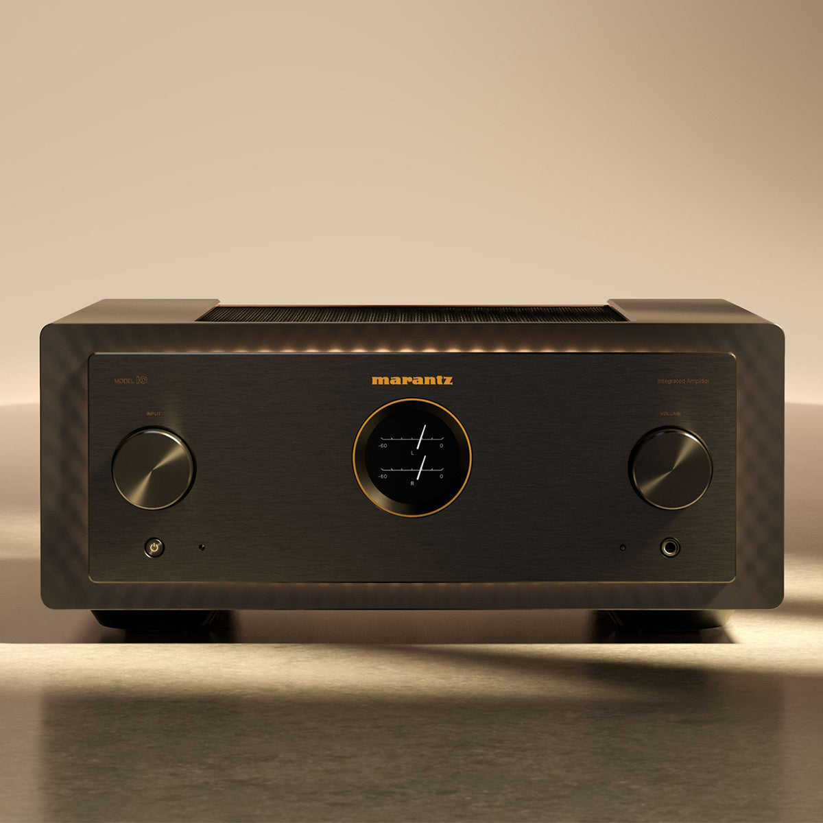 Designed with a brushed aluminum control surface, MODEL 10 is encased in a copper-plated, triple layered chassis with illuminated mesh cover grille. Lighting inside the amplifier showcases the circuit boards, high-quality components, and specially designed transformer case. In a nod to the Marantz design DNA, MODEL10’s porthole houses a high-resolution full color OLED display for volume and input selection, along with a digital VU meter that behaves like vintage analog meters.