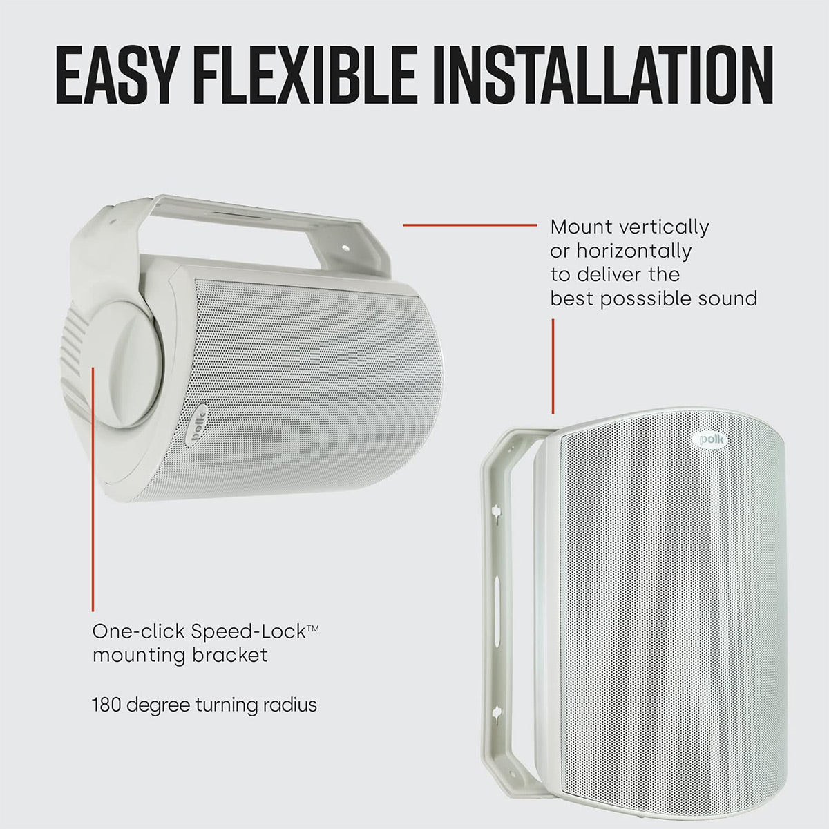 Sprucing up the patio or backyard is a cinch with easy, secure one-handed installations even in difficult locations. The Speed-Lock Mounting System ensures easy, safe one-handed installations and no-slip setting of the speaker angle. This greatly simplified mounting procedure means fewer parts and a quicker setup.