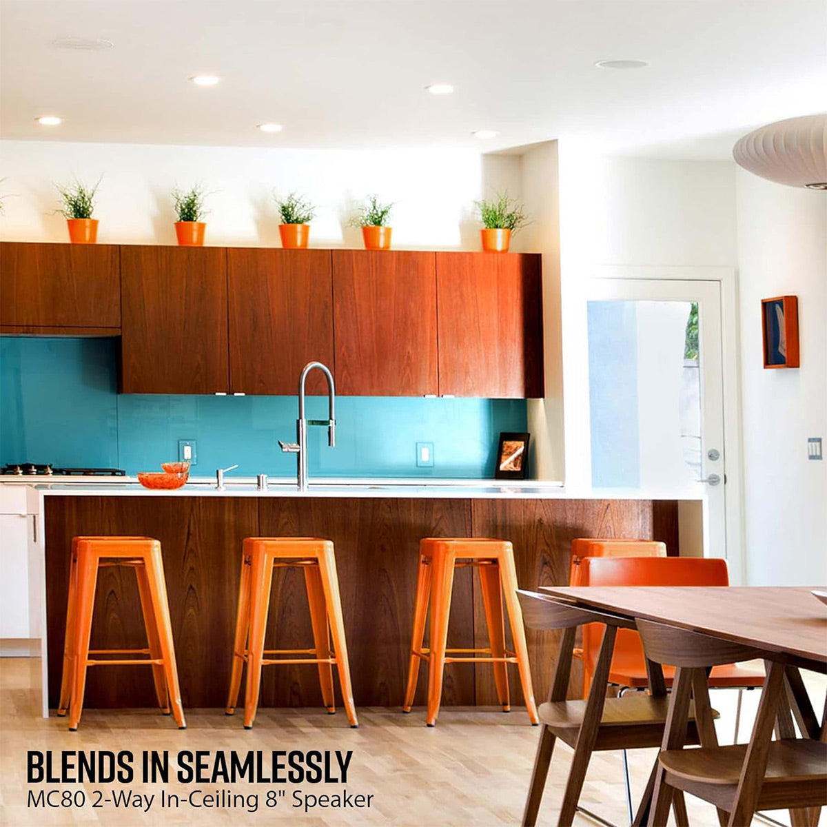 Fill your room with great sound, without sacrificing an inch of floor space to bulky speakers. Polk's MC80 speakers install flush in your ceiling for a sleek, décor-friendly look. The 3/4" aimable tweeter lets you direct the high-frequencies where you like, so you can fine-tune your system's sound. The 8" woofer provides rich, smooth lows. And this speaker's moisture-resistant design means you can use it in your kitchen, bathroom, or even under the eaves outside.