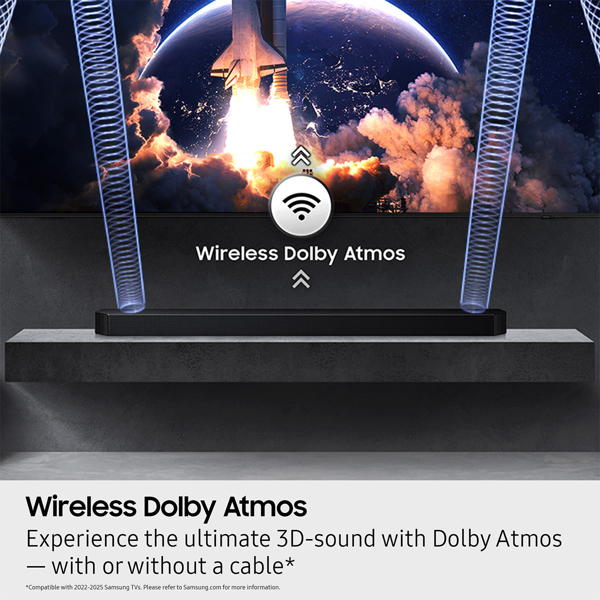 - Rear speakers connect to each other via wired connection. Requires a compatible 2025 soundbar [Q600F, B750F, B650F, B450F and S700D/701D] and included power cable.