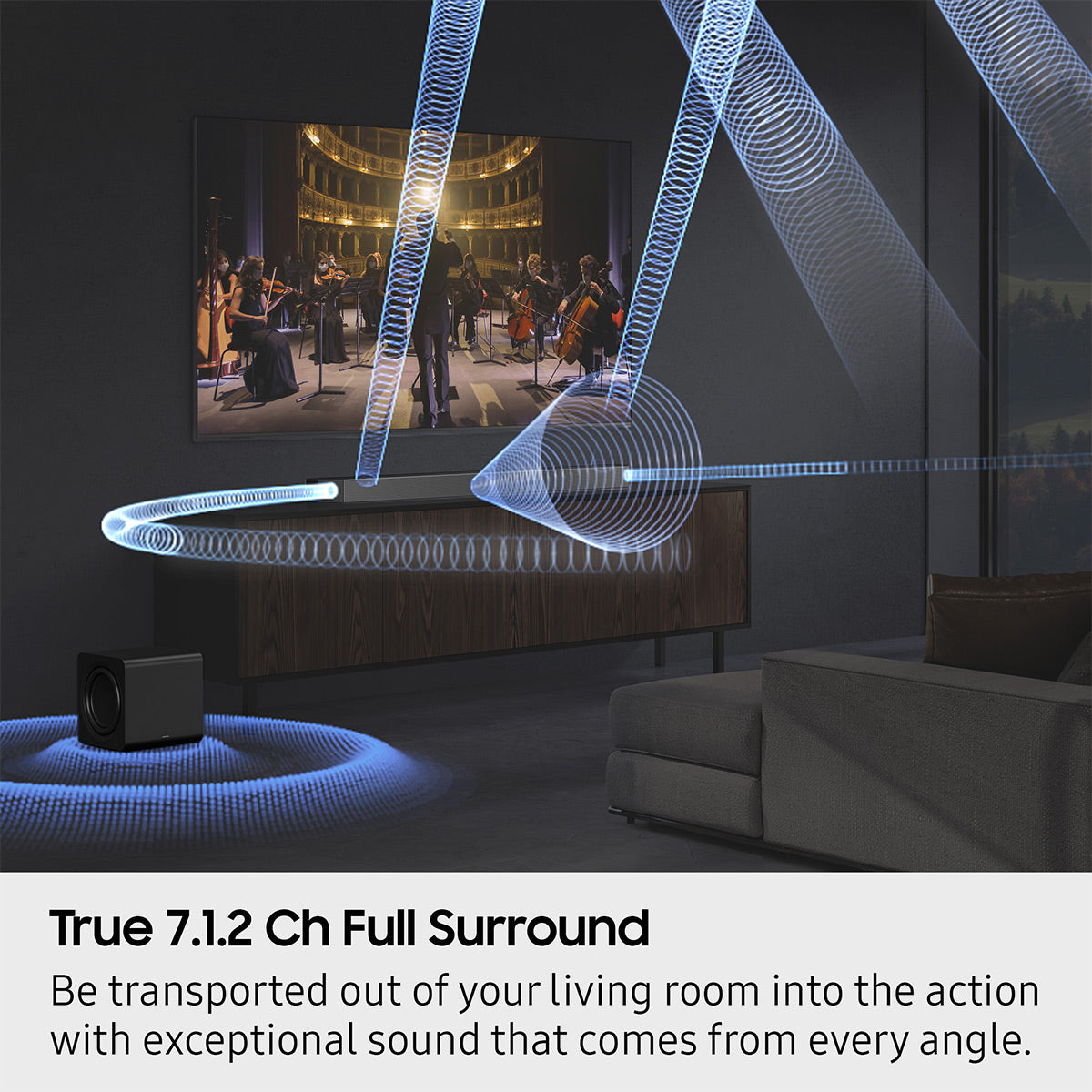 Feel the pulse of every scene with immersive, three-dimensional sound that is perfectly calibrated for your space. Designed to deliver sound from every angle, this soundbar features 7 front channels, 1 subwoofer, and 2 up-firing channels, bringing theater-quality audio to your living room. With a wireless surround system that minimizes cable clutter, your home entertainment is about to get a serious upgrade.
