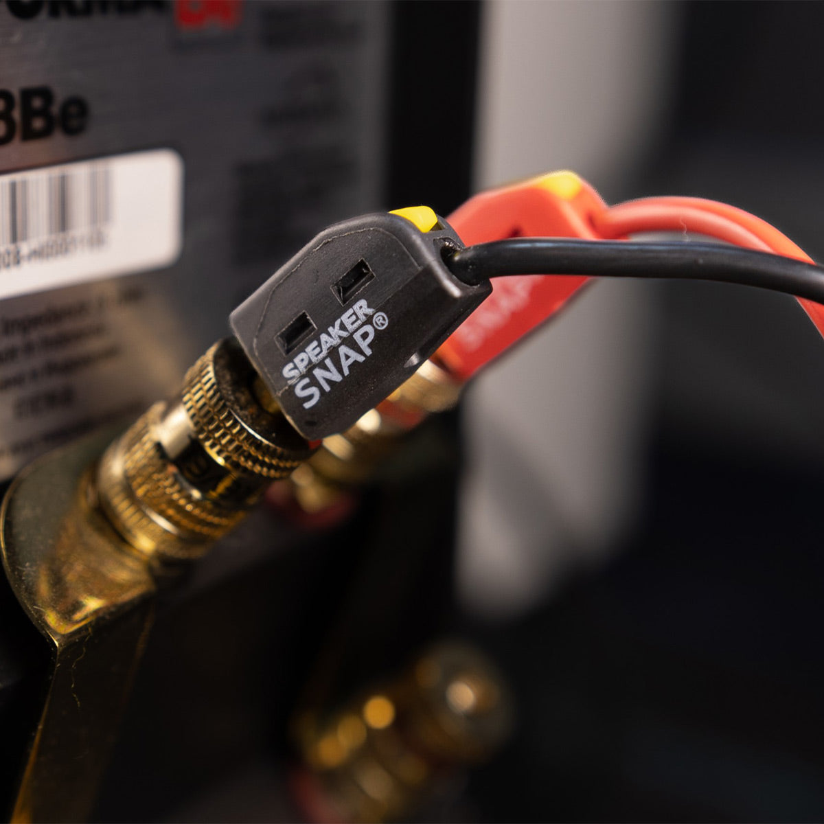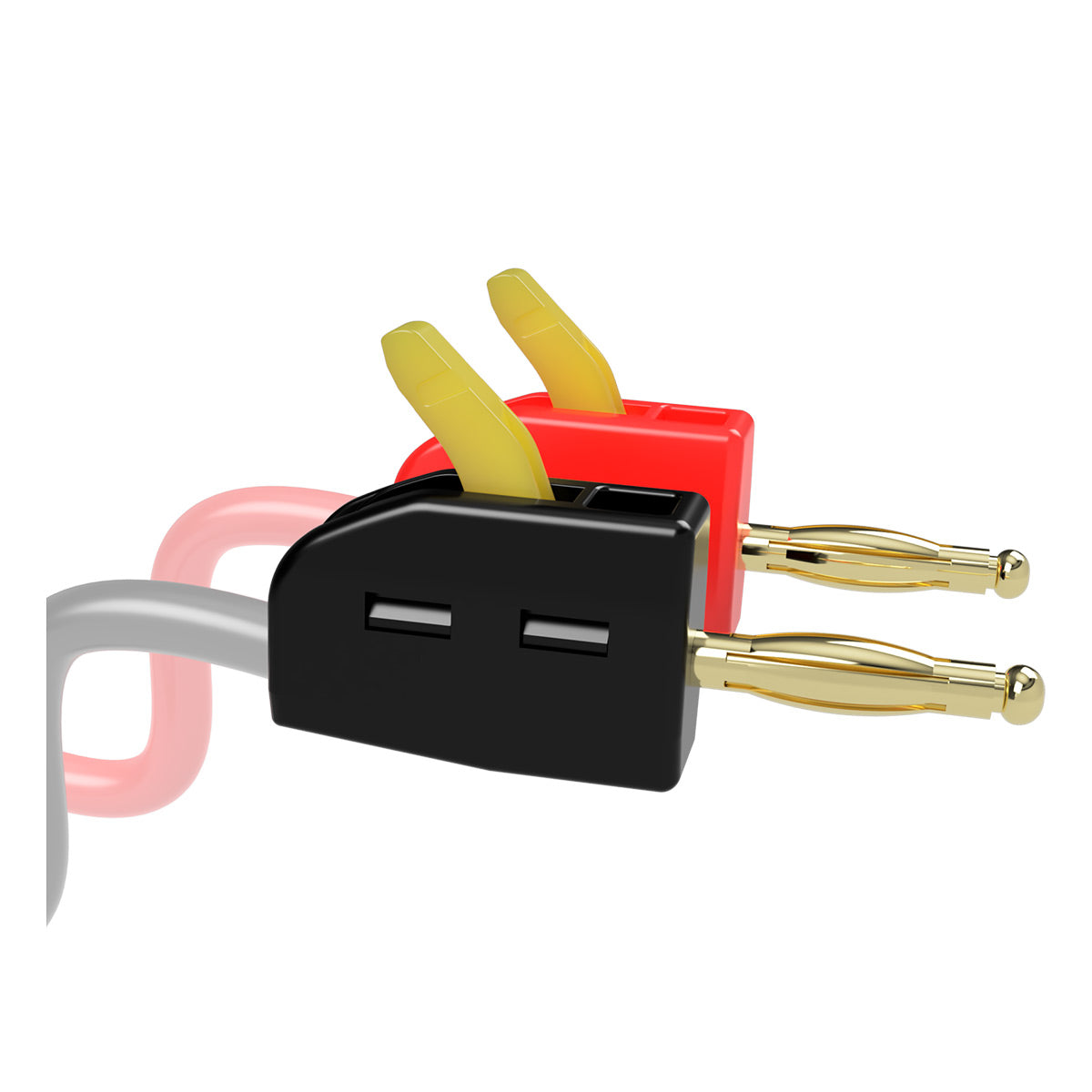 Speaker Snap provides the fastest, simplest banana plugs in the industry. The connectors use a patent pending lever to make a secure connection – no set screw required! The powerful spring and gold-plated plug lock the wire in place for a solid electrical connection. They support 12-24 AWG wire without the need for multiple products or fittings. Speaker Snap banana plugs are a must-have timesaver for every A/V installer.